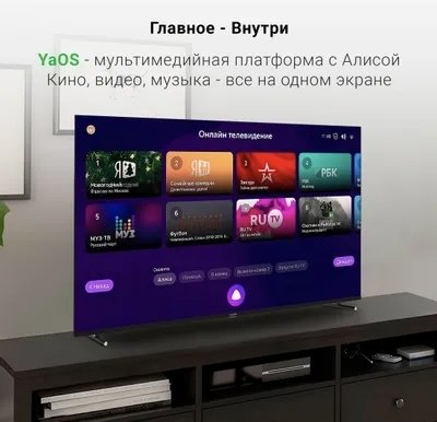 Модель работает на базе ОС YaOS и поддерживает Smart TV, что обеспечивает доступ к большому количеству бесплатных каналов без необходимости подключения телевизионной антенны или подписки на онлайн-сервисы. Телевизор запишет передачу или очередную серию любимого сериала, чтобы пользователь мог посмотреть ее в удобное время.